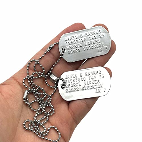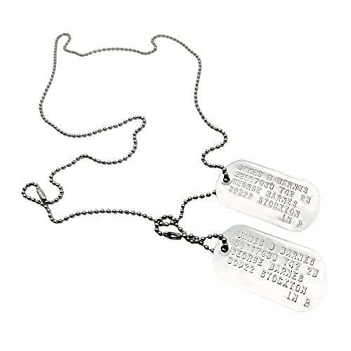 Deze zijn gemaakt met authentieke roestvrijstalen stijlblanks. De set wordt geleverd met twee militaire standaard hondenlabels, een 30 inch roestvrij stalen ketting en een 4 inch roestvrij stalen ketting. U kunt ook een aangepaste versie van deze tags aanvragen.
