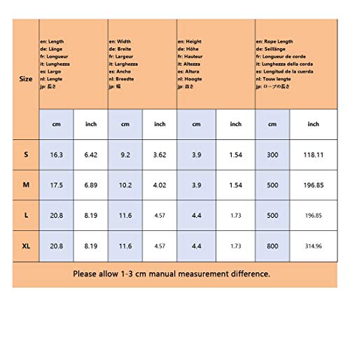 De M maat van de oprolbare hondenriem kan worden verlengd tot 3 m / 9.8ft, geschikt voor honden onder 15 kg / 33 lbs. M grootte kan worden verlengd tot 5 m / 16.4ft, geschikt voor honden onder 20 kg / 44 lbs. L grootte kan worden verlengd tot 5 m / 16.4ft, sterkere trekkracht is geschikt voor honden tot 50 kg / 110 lbs. XL grootte kan worden uitgebreid tot 8 m / 26.2ft, geschikt voor honden onder 50 kg / 110 lbs