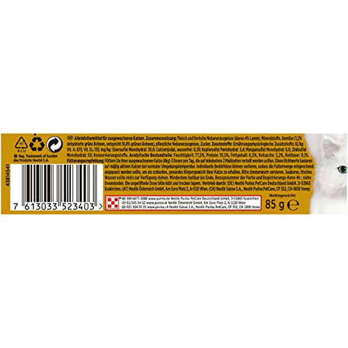 Inhoud: 12 x 85 g blikjes Gourmet goud, fijne pasta met lam en groene bonen, hoogwaardige kattenvoering, van Purina Gourmet goud.