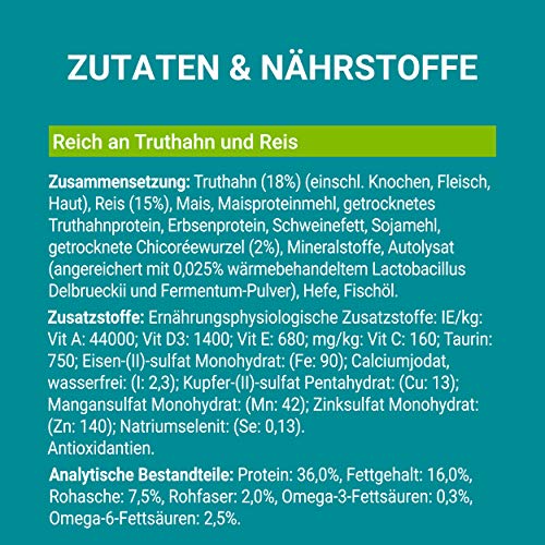 Buitengewone smaakervaring: kwalitatief hoogwaardige ingrediënten met kalkoen als ingrediënt nr 1 en rijst geven katten de voedingsstoffen die ze nodig hebben voor hun levensstijl en zorgen tegelijkertijd zelfs bij de keuze van katten voor een goede smakelijkheid