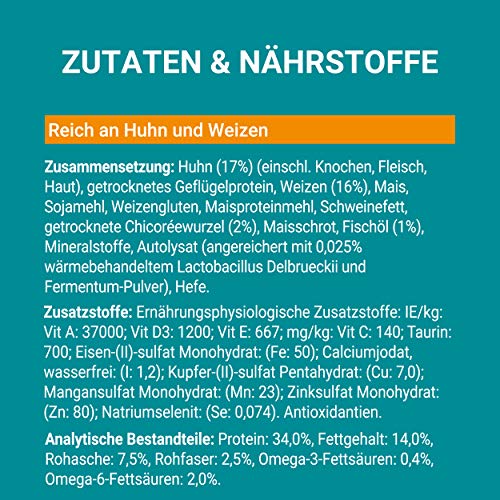 Unieke voedingsstofformule: de smakelijke formules met hoogwaardige ingrediënten en kip als hoofdingrediënt versterken aantoonbaar de natuurlijke afweer van de kat van binnen naar buiten, terwijl omega-6-vetzuren en zink een gezonde huid en een glanzende vacht ondersteunen;
