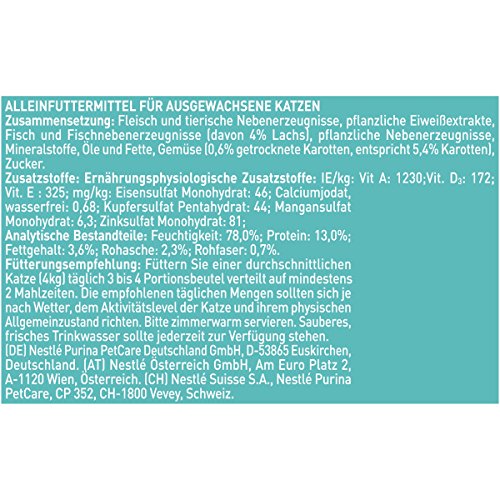 Inhoud: 24 x 85 g met zalm en wortels, nat voer voor gecastreerde katten van Purina ONE