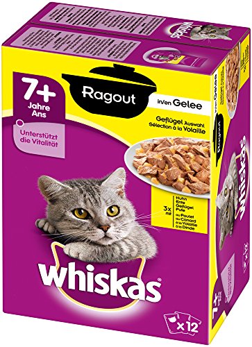Inhoud: 4 x 12 x 85 g whiskas 7 + kattenvoer Ragout – gevogelte selectie in gelei, toevoeging van taurine voor een gezond hart, met de smaak van kip, eend, gevogelte en kalkoen