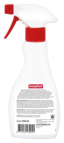 Beaphar huidverzorgingsspray is een speciaal ontwikkeld mild verzorgingsproduct, afgestemd op de huid van honden en katten, om irritaties zoals jeuk, roos en droge huid te voorkomen. De hydraterende ingrediënten van aloë vera kalmeren samen met glycerine de huid en houden ze glad en soepel. Nachtkaarsenolie levert waardevolle grondstoffen voor het opbouwen van belangrijke lichaamseigen stoffen, ze kalmeren gevoelige huid en helpen bovendien om het natuurlijke vochtgehalte van de huid te behouden.
