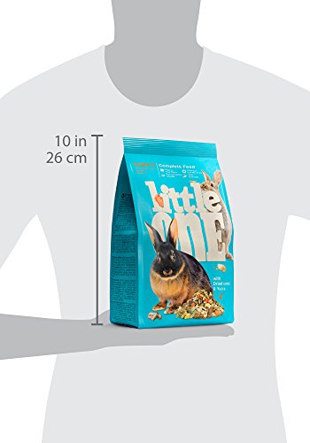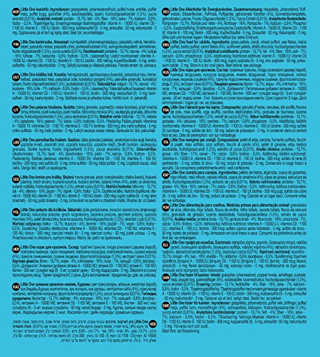 Feed for rabbits with grass and sunflower pellets, various puffed ingredients and flakes, dried carrot and carob.