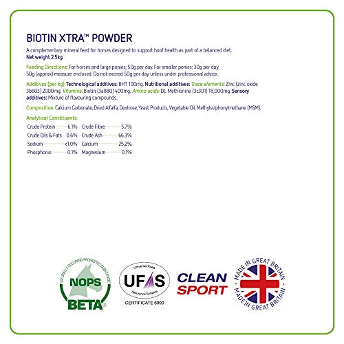 NATUURLIJKE INGREDIËNTEN – Biotine Xtra Powder biedt een volledige 20 mg biotine per 50 g dagelijkse dosis, evenals zink en zwavel die aminozuur methionine bevatten om sterke, gezonde hoeven te bevorderen