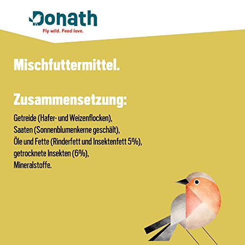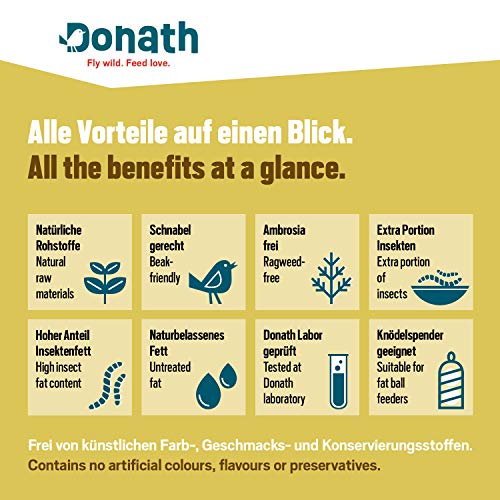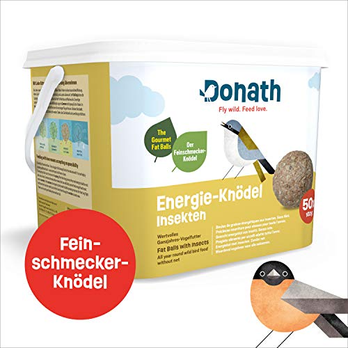 Donath Insecten Energie Ballen zonder Net zijn vooral populair bij alle meesoorten, mussen, boomklevers, vinken, spreeuwen en ook spechten. Deze energieballen zijn gemaakt met insectenvet gemaakt van ca. 3000 insecten per kg dumplings, gezonde, hartige haver- en tarwevlokken, vitaminerijk, olierijk, gepelde zonnebloempitten, fijnste rundervet. Ideaal om het hele jaar door te voeren. Komt in 5 kg.