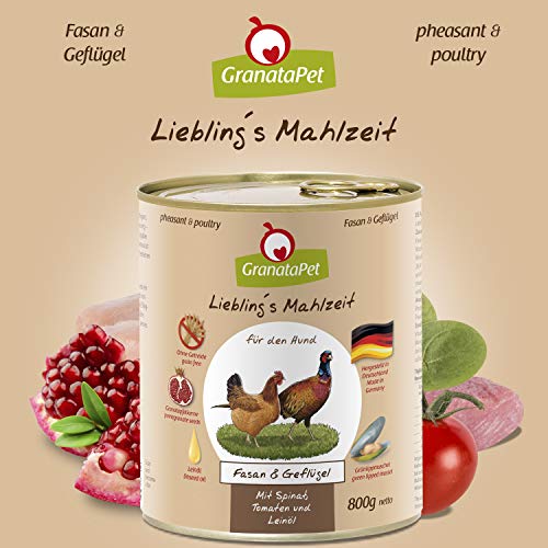 Inhoud: 6 x 800 g favoriete maaltijd fasan & gevogelte, natuurlijk nat voer voor volwassen honden van GranataPet.