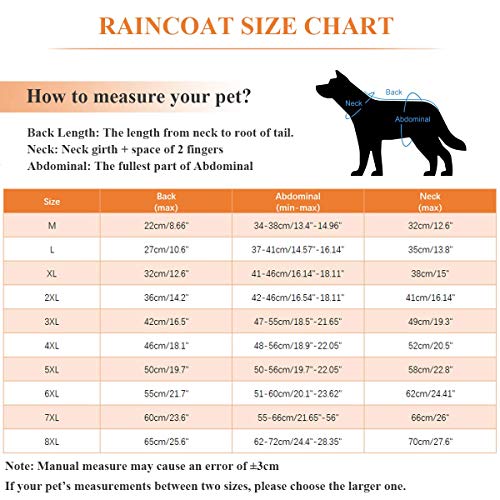Maatgidsen – Zorg voor verschillende lichaamsmaten van verschillende honden, meet de lichaamsmaat van je huisdier voordat je koopt en selecteer het product volgens de maatfoto. Voeg tot twee inch toe voor de borstomvang bij het kiezen van hun maat om te voorkomen dat de regenjas te strak is.