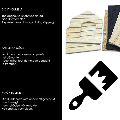 Eenvoudige montage: Je hebt alleen een schroevendraaier nodig om de kennel in elkaar te zetten, het duurt 15 minuten om de elementen eenvoudig in elkaar te draaien. Het product wordt in twee verpakkingen verzonden. Nadat de kennel is gemonteerd, moet je hem met de meegeleverde kleuren beschilderen.