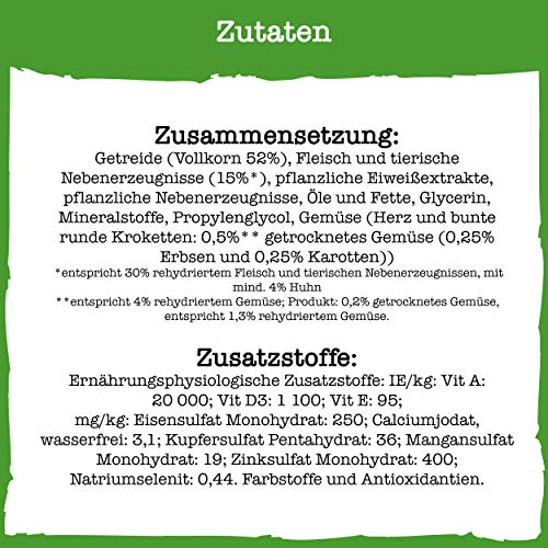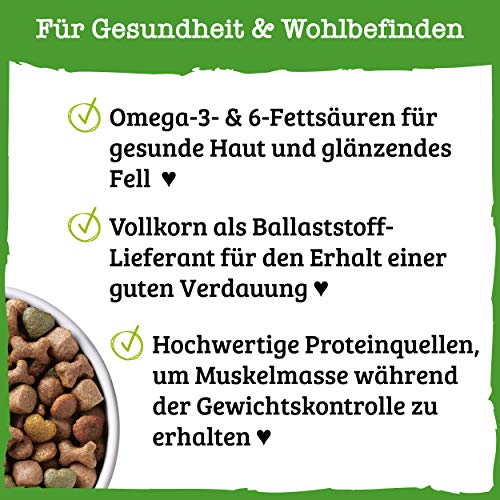 Purina Beneful feel-good weight ondersteunt een gezond, uitgebalanceerd lichaamsgewicht dankzij het recept met kip, tuingroenten en vitamines. Zonder toegevoegde kunstmatige kleuren. Hoogwaardige eiwitbronnen helpen de spiermassa te behouden tijdens gewichtsbeheersing. Purina Beneful feel-good gewicht bevat 20% minder vet dan Purina Beneful Original. Bovendien is Purina Beneful feel-good verteerd. Het droge kippenvoer is verrijkt met omega 3 & 6 vetzuren, waardoor de vacht van je favoriete glans glanst en een gezonde huid wordt ondersteund. Feelgood gewicht – feelgood leven. Purina Beneful het droogvoer voor een uitgebalanceerd dieet met een geweldige smaak. Purina Beneful – Het deel van vreugde. Samenstelling: Granen (volkoren 52%), vlees en dierlijke bijproducten (15% ), extracten van plantaardige eieren, plantaardige bijproducten, oliën en vetten, glycerine, mineralen, propyleenglycol, groenten (hartjes en kleurrijke kroketten: 0,5% gedroogde groenten (0,25% erwten en 0,25% wortels)) komt overeen met 30% gerehydrateerd vlees en dierlijke bijproducten, met minimaal 4% kip komt overeen met 4% gerehydrateerde groenten. Product: 0,2% gedroogde groenten, komt overeen met 1,3% gerehydrateerde groenten.