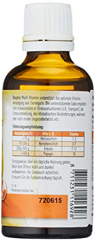 Het Beaphar Multi Vitmain Complex versterkt de weerstand van de vogel en ondersteunt het vogelorganisme in stresssituaties, zoals bij tentoonstellingen of tijdens de broeitijd. Vitaliteitsverlies, zoals hij bijvoorbeeld bijvoorbeeld bij niet-evenwichtige voeding kan optreden, wordt door Vinka opgelost. Voederadvies: breng de druppels op de dagelijkse voering. Voor gebruik schudden. Vervang het voedermengsel dagelijks Lichaamsgewicht bijvoorbeeld druppels < 75 g wellensittafel 1-3 75-250 g nymfenietiek 3-7 250 g 500 g cacadu 7-14 > 500 g papegaai 18